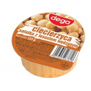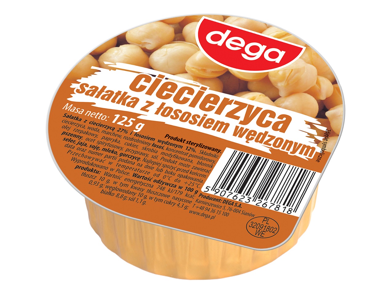 Sałatka z ciecierzycą 26% i łososiem wędzonym 12%. Główne składniki to ciecierzyca, marchew, rozdrobniony łosoś, przecier marchwiowy, koncentrat pomidorowy, olej rzepakowy, papryka, przyprawy. Produkt sterylizowany. Może zawierać seler, jaja, soję, mleko, gorczycę.
