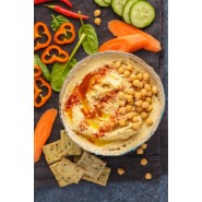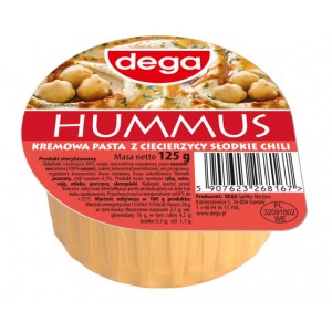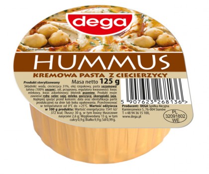 Kremowa pasta z ciecierzycy z dodatkiem pasty sezamowej tahina (100% sezam) oraz delikatnych przypraw. Produkt sterylizowany. Może zawierać ryby, seler, soję, mleko, gorczycę, skorupiaki.