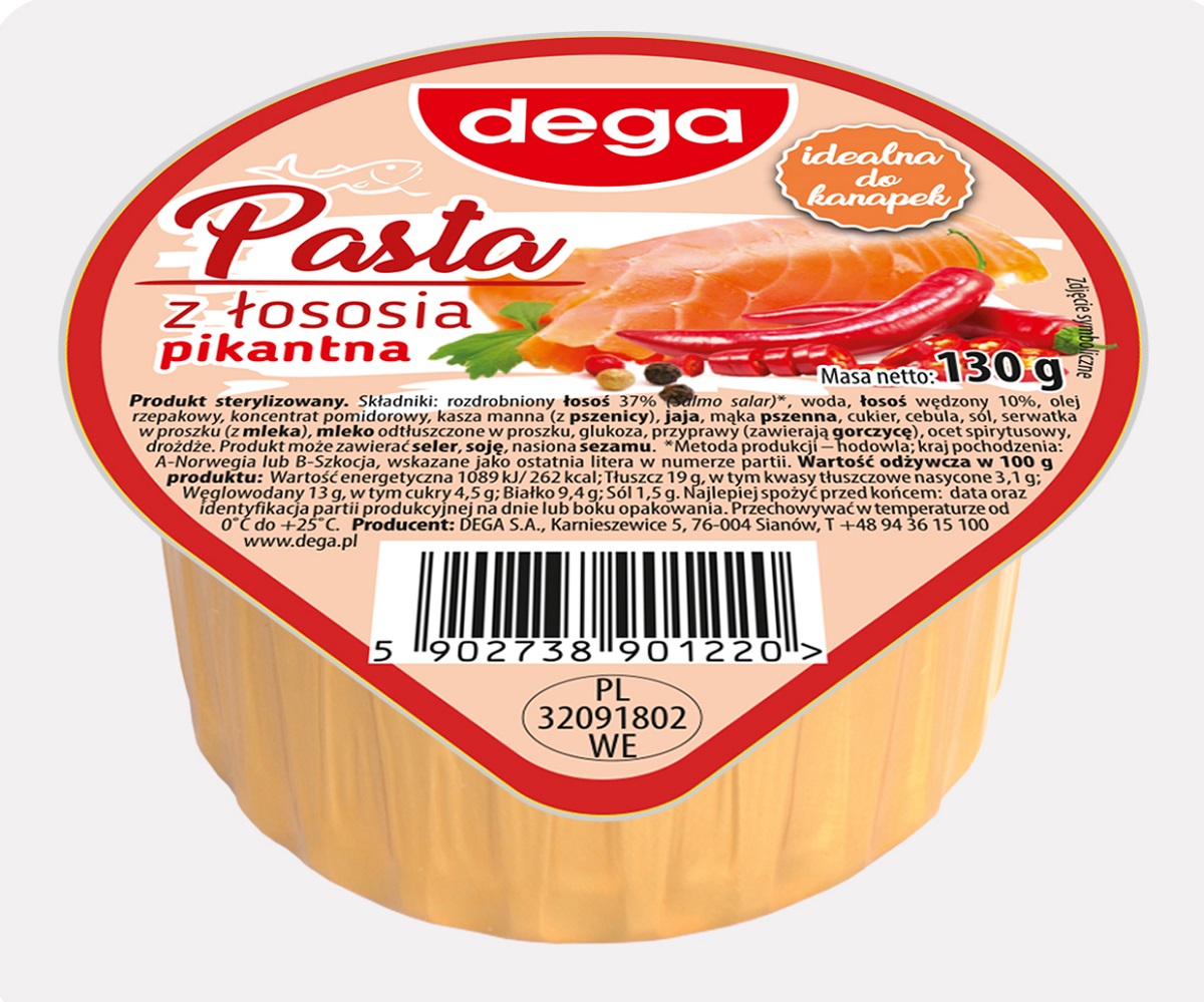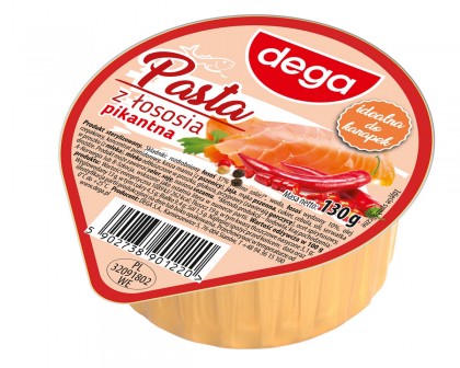 Pyszna pasta z najwyższej jakości łososia wędzonego z olejem rzepakowym, koncentratem pomidorowym, kaszą manną oraz jajkiem. Pikantnie przyprawiona - dla amatorów przekąsek z charakterem. Idealna do kanapek, naleśników i tortilli.