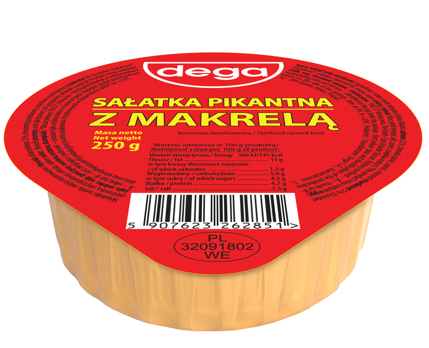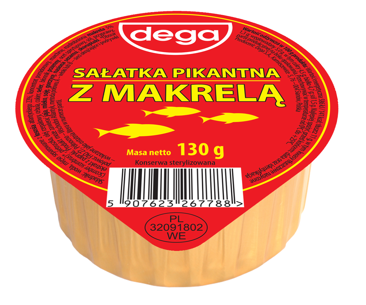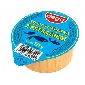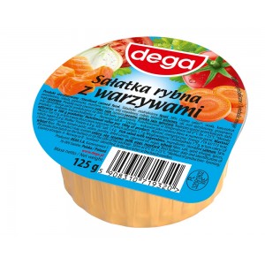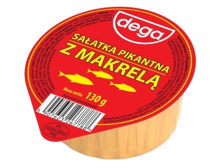 Sałatka na bazie ryb morskich, w tym makreli oraz warzyw takich jak marchew, seler, cebula, pietruszka z dodatkiem koncentratu pomidorowego i przypraw. Produkt sterylizowany. Może zawierać jaja, mleko, soję, gorczycę.