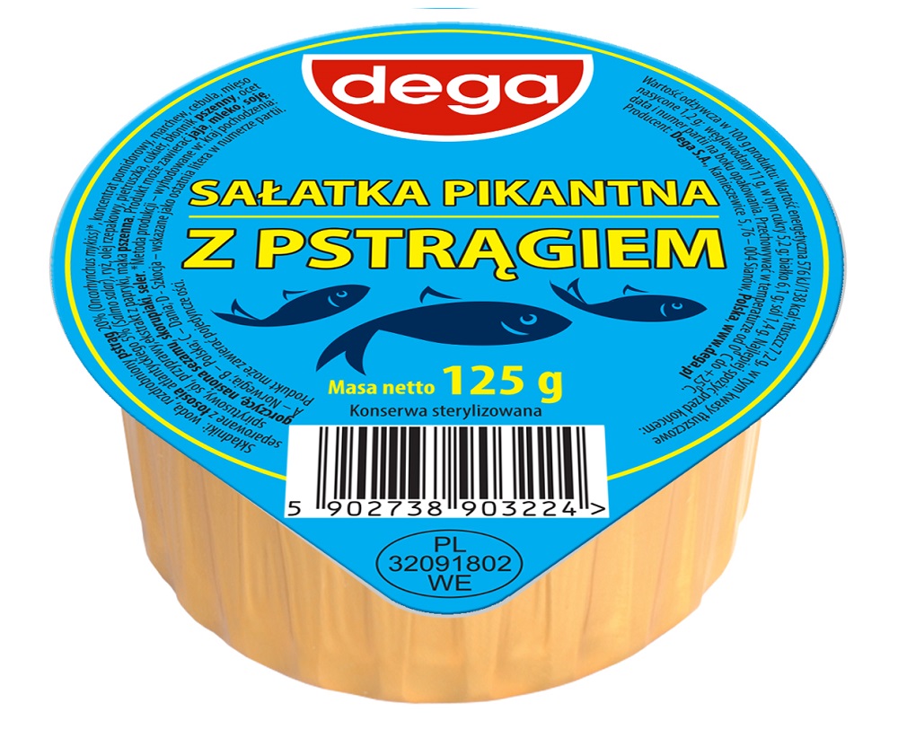 Wyrazista, pikantna sałatka na bazie mięsa z pstrąga oraz kompozycji warzyw takich jak cebulka, marchew, pietruszka. Propozycja z charakterem dla amatorów lekko pikantnych potraw. Unikatowa receptura DEGA.